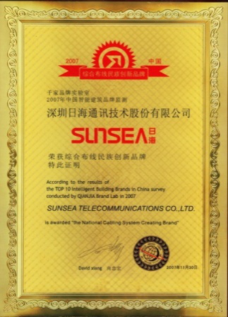 From November 29 to November 30, 2007, Sunsea Telecommunications Cabling was invited to Shanghai Guangda Convention & Exhibition Center Hotel for participation in the "2007 China International Building Intelligence Summit and Award Ceremony " which was organized by 1000 Net and won the " Cabling System National Creating Brand "special award.
